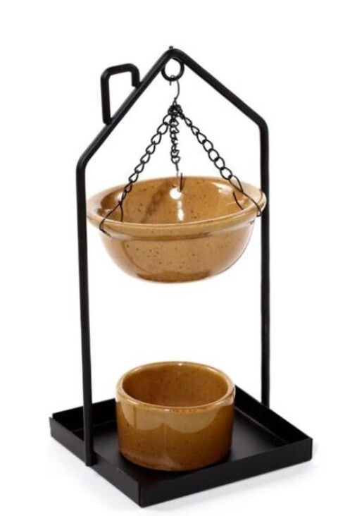 Diese elegante Duftlampe vereint stilvolles Design mit gemütlicher Atmosphäre. Die schwebende Schale aus tiefblauer Keramik hängt an filigranen Ketten in einem schwarzen Metallrahmen – ein echter Hingucker im nordisch-modernen Stil. Durch das Teelicht im unteren Gefäß wird das Duftöl sanft erwärmt und verbreitet einen wohligen, gleichmäßigen Duft im ganzen Raum.