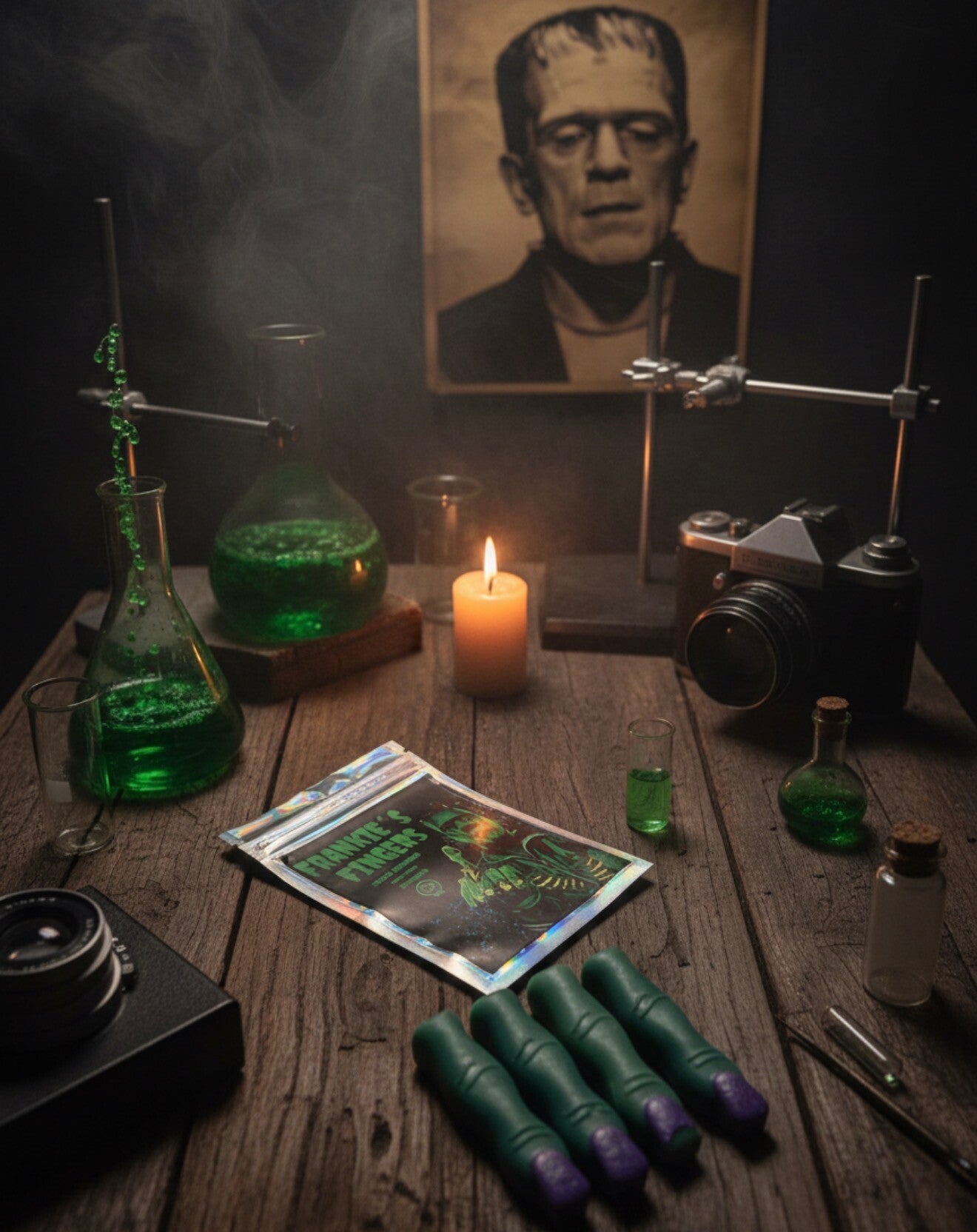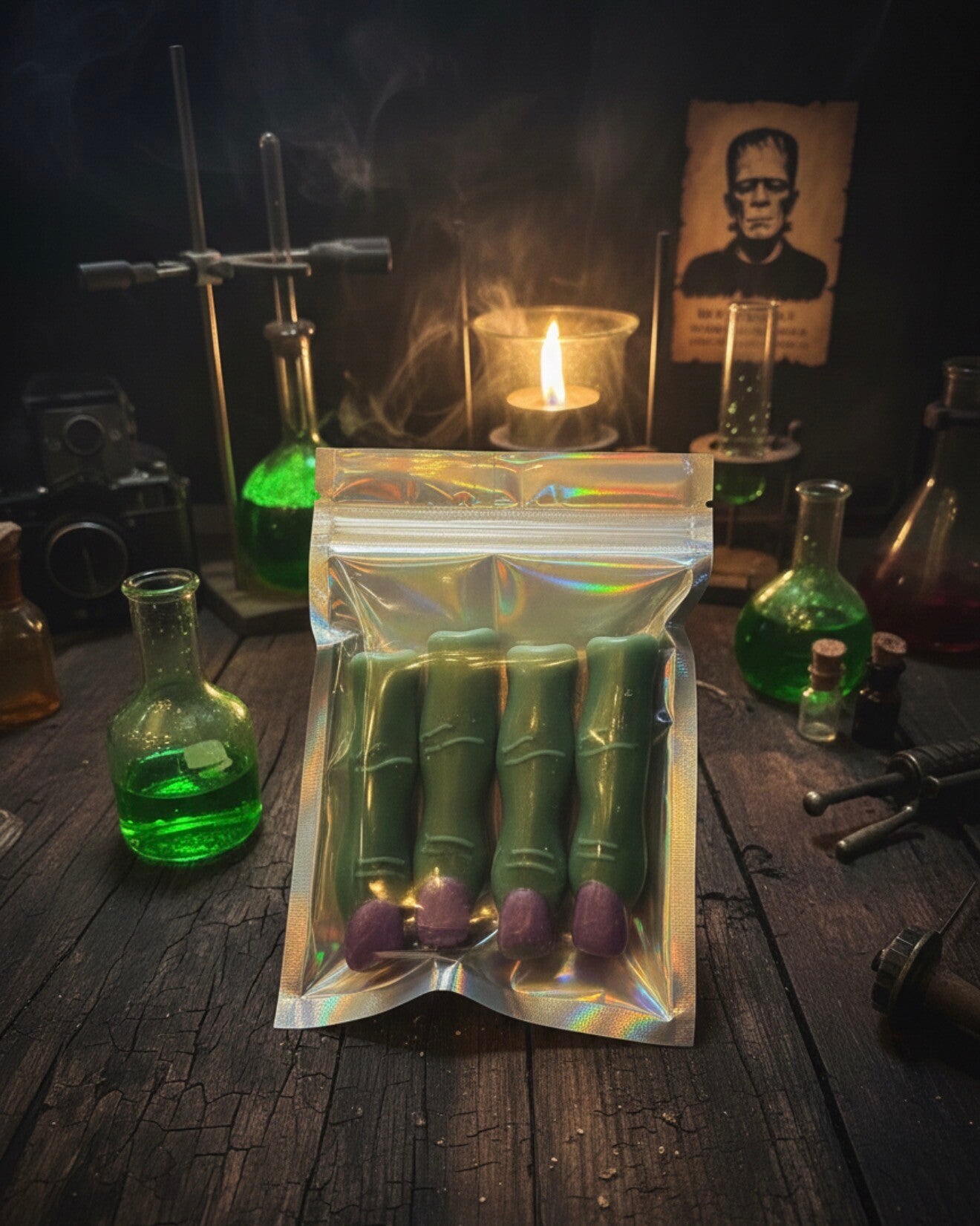 Erwecke die Atmosphäre von Dr. Frankensteins geheimnisvollem Labor direkt in deinem Wohnzimmer. Unser handgefertigtes Duftwachs Frankie’s Fingers besticht nicht nur durch seine detailgetreue Optik, sondern auch durch eine tiefgründige Duftkomposition. Spritzige Bergamotte trifft auf erdiges Patchouli, während warme Vanille und sinnlicher Moschus für eine behagliche, fast mystische Tiefe sorgen. Jede Packung enthält 65 Gramm hochwertiges Wachs, das darauf wartet, deine Sinne mit seinem unheimlich guten Aroma zu verzaubern.