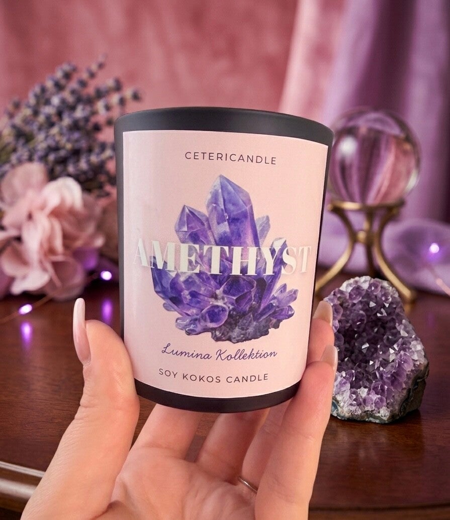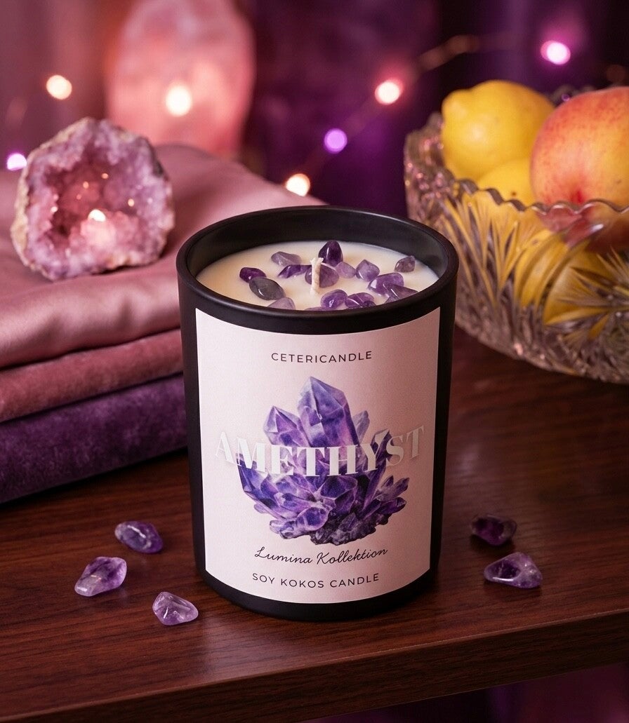• Gelassenheit: Die Schwingung des Amethysts spiegelt sich in der ruhigen Flamme und dem Duft wider, was zu einer tiefen inneren Ruhe führt.